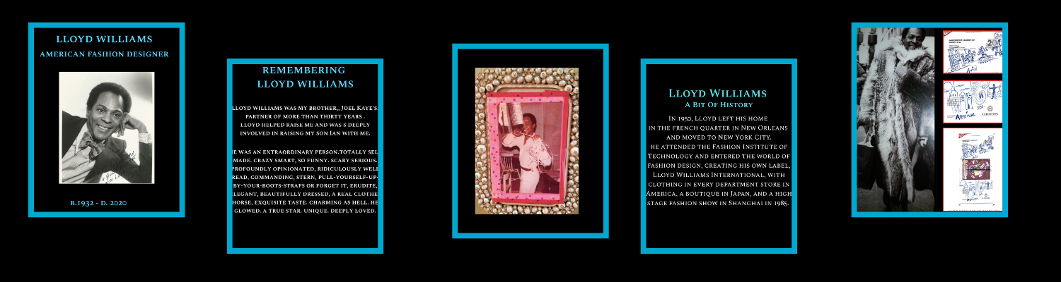 In 1950, Lloyd left his home in New Orleans and moved to New York City, attended the Fashion Institute of Technology and entered the world of fashion design, creating his own label, Lloyd Williams International, with clothing in every department store in America, a boutique in Japan, and a high stage fashion show in Shanghai in 1985. Lloyd passed away in New York City in 2020 at the age of 88.